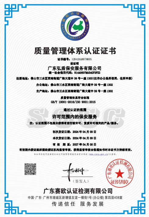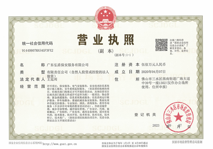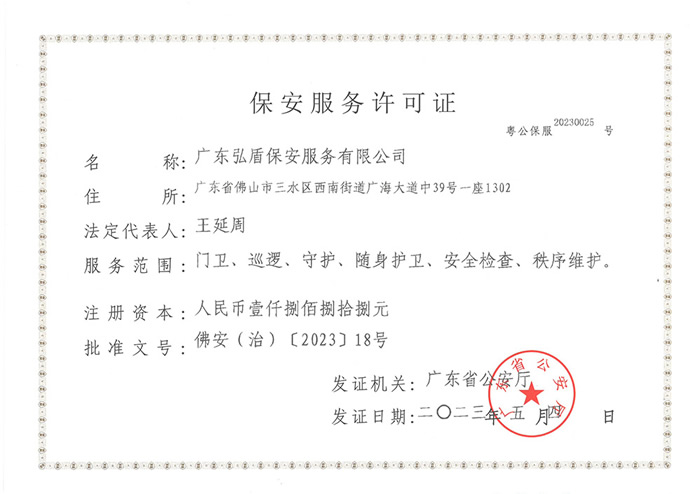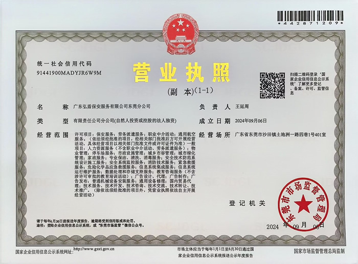 - 廣東弘盾保安服務(wù)有限公司東莞分公司是經(jīng)東莞市公安局嚴(yán)格審核,廣東省公安廳批準(zhǔn)頒發(fā)《保安服務(wù)許可證》,在東莞市工商行政管理機(jī)關(guān)登記注冊(cè)的,依法開(kāi)展門(mén)衛(wèi)、巡邏守護(hù)、秩序維護(hù)、隨身護(hù)衛(wèi),安全檢查等綜合安保服務(wù)的專(zhuān)業(yè)保安服務(wù)公司... [詳細(xì)介紹]
